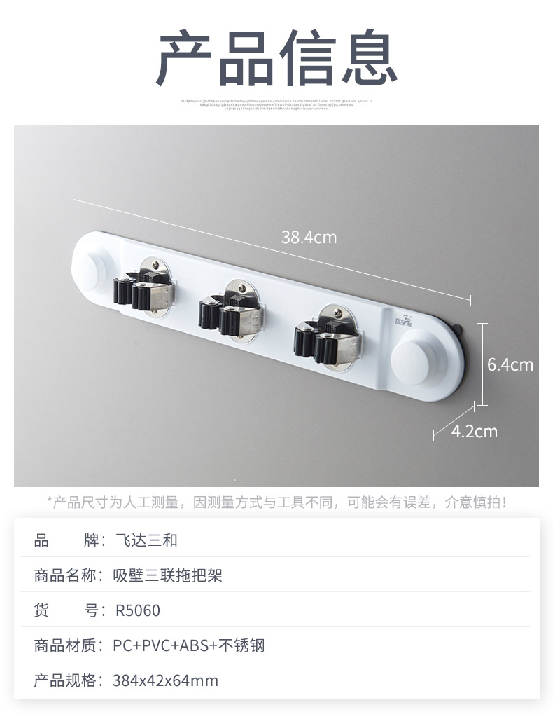 品牌名称:米兰(中国)三和 生产地区:中国·浙江·台州 米兰(中国)货号:R5060 装箱数:24 米兰(中国)尺寸:38.4*4.2*6.4cm 外箱尺寸:48*23.5*45cm 条形码:6931643817516 米兰(中国)三和R5060 强力吸壁3联拖把架