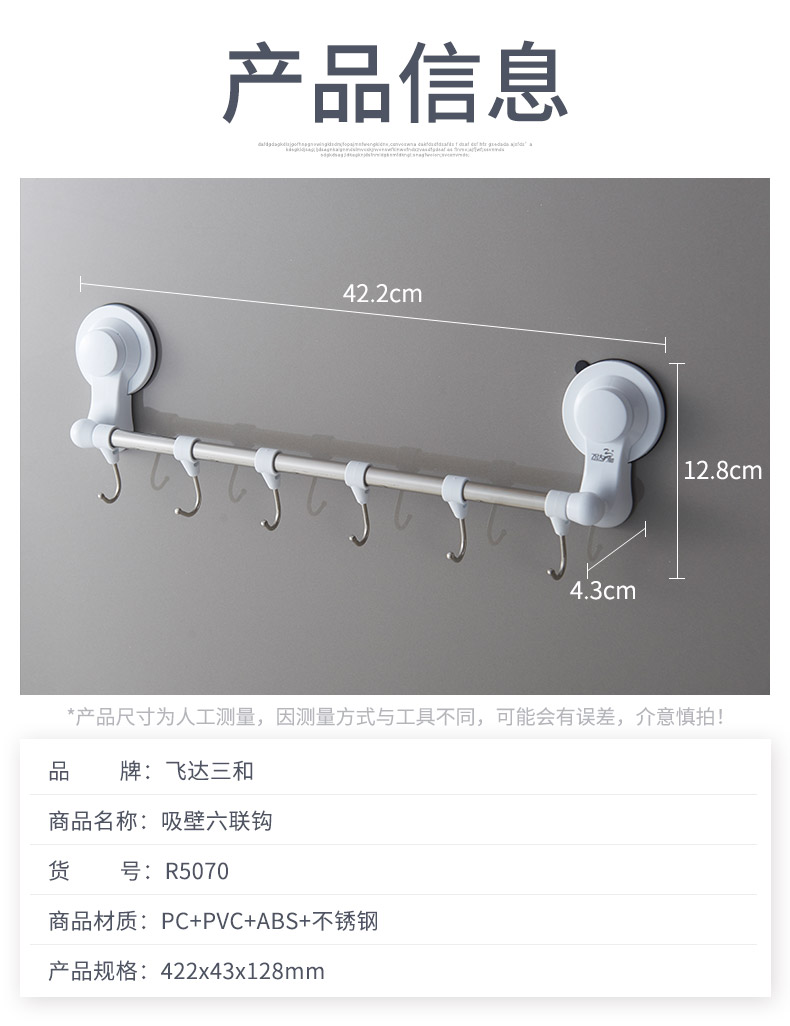 品牌名称:米兰(中国)三和 生产地区:中国·浙江·台州 米兰(中国)货号:R5070 装箱数:48 米兰(中国)尺寸:42.2*4.3*12.8cm 外箱尺寸:53*45.5*34.5cm 条形码:6931643817523 米兰(中国)三和R5070 强力吸壁六联钩