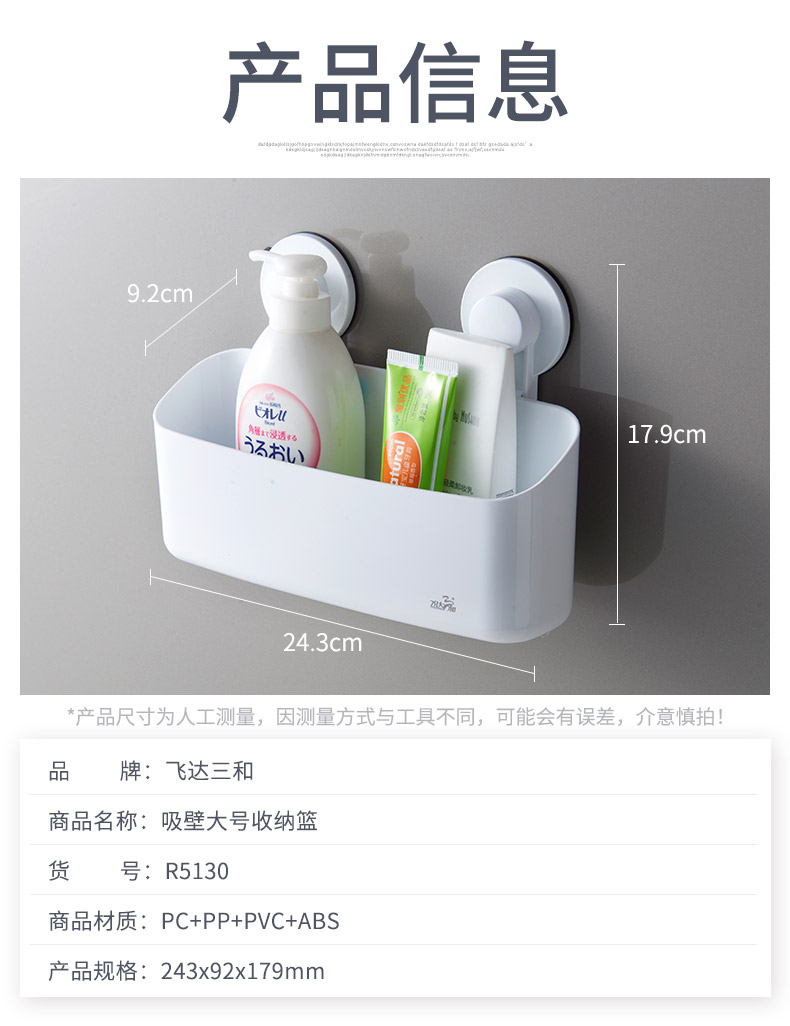品牌名称:米兰(中国)三和 生产地区:中国·浙江·台州 米兰(中国)货号:R5130 装箱数:24 米兰(中国)尺寸:24.3*9.2*17.9cm 外箱尺寸:42*36*52cm 条形码:6931643817585 米兰(中国)三和R5130 强力吸壁大号收纳篮