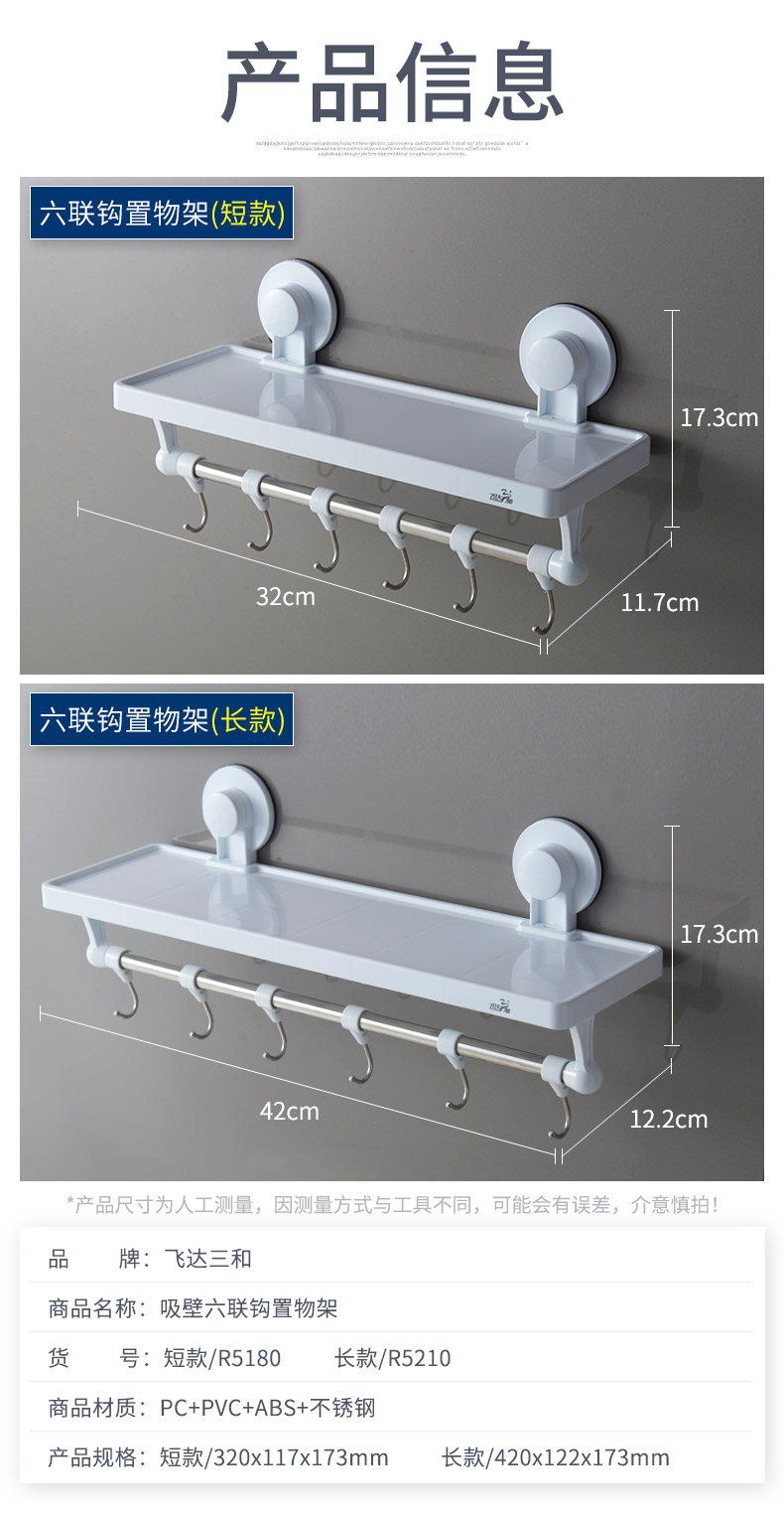 品牌名称:米兰(中国)三和 生产地区:中国·浙江·台州 米兰(中国)货号:R5180/R5210 装箱数:36 / 24 米兰(中国)尺寸:32*11.7*17.3 / 42*12.2*17.3cm 外箱尺寸:57*39.5*36.5 / 57*26.5*46.5cm 条形码:6931643817639 / 6931643817660 米兰(中国)三和R5180 / R5210 强力吸壁六联钩置物架