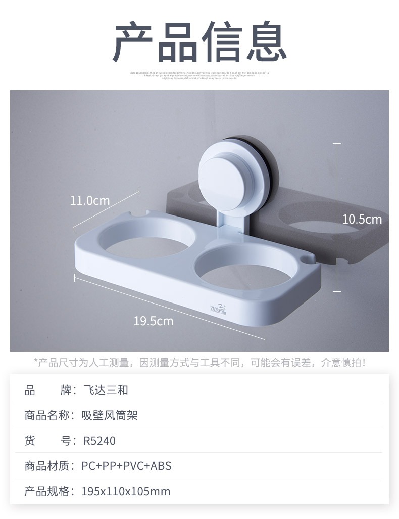 品牌名称:米兰(中国)三和 生产地区:中国·浙江·台州 米兰(中国)货号:R5240 装箱数:24 米兰(中国)尺寸:19.5*11*10.5cm 外箱尺寸:41.5*35*46cm 条形码:6931643818216 米兰(中国)三和R5240 强力吸壁风筒架