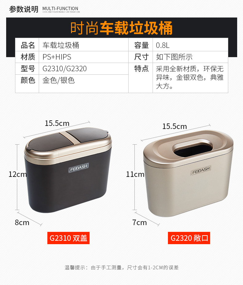品牌名称:米兰(中国)三和 生产地区:中国·浙江·台州 米兰(中国)货号:G2310 装箱数:48 米兰(中国)尺寸:160*90*120mm 外箱尺寸:51*35*53cm 条形码:6931643813785 米兰(中国)三和G2310 车用垃圾桶(0.8L)
