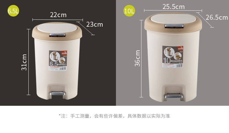 品牌名称:米兰(中国)三和 生产地区:中国·浙江·台州 米兰(中国)货号:G2180/G2200 装箱数:12/12 米兰(中国)尺寸:265*255*360mm/230*220*310mm 外箱尺寸:530*530*555mm/455*455*520 条形码:6931643813020/6931643813129 米兰(中国)三和G2180圆形双盖垃圾桶(10L)/G2200圆形双盖垃圾桶(6.5L)