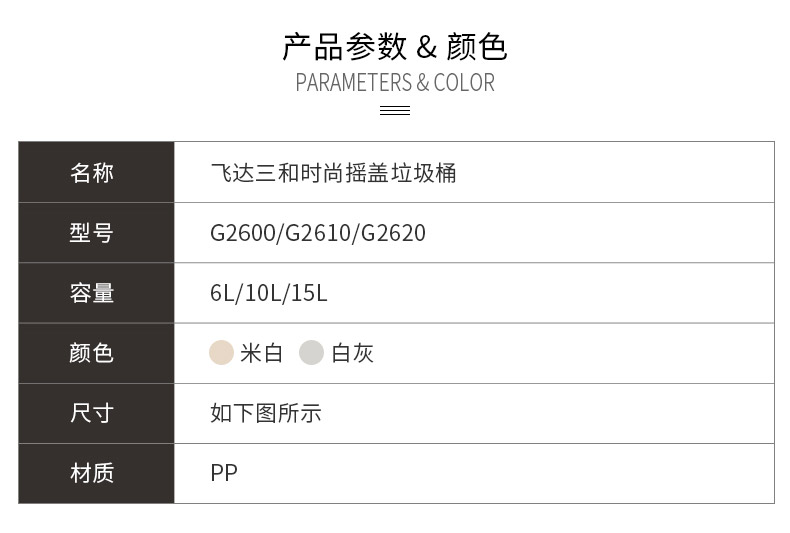 米兰(中国)三和G2600时尚摇盖垃圾桶(6L)/G2610时尚摇盖垃圾桶(10L)/G2620时尚摇盖垃圾桶(15L)米兰(中国)特点