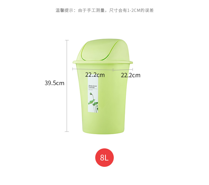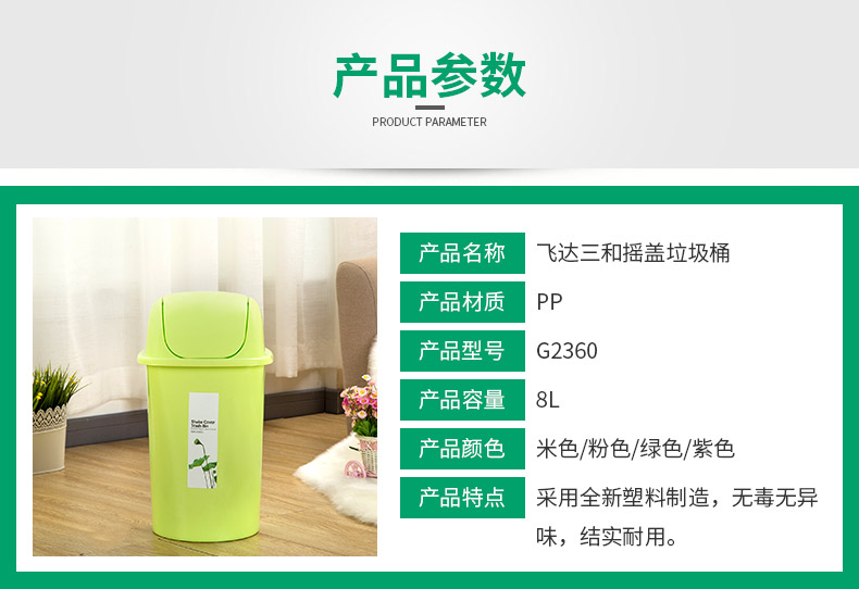 品牌名称:米兰(中国)三和 生产地区:中国·浙江·台州 米兰(中国)货号:G2360/G2370 装箱数:12/12 米兰(中国)尺寸:222*222*395mm/202*202*355mm 外箱尺寸:62*46*24cm/60.5*42*22cm 条形码:6931643814454/6931643814461 米兰(中国)三和G2360 摇盖垃圾桶(8L) / G2370 摇盖垃圾桶(6L)