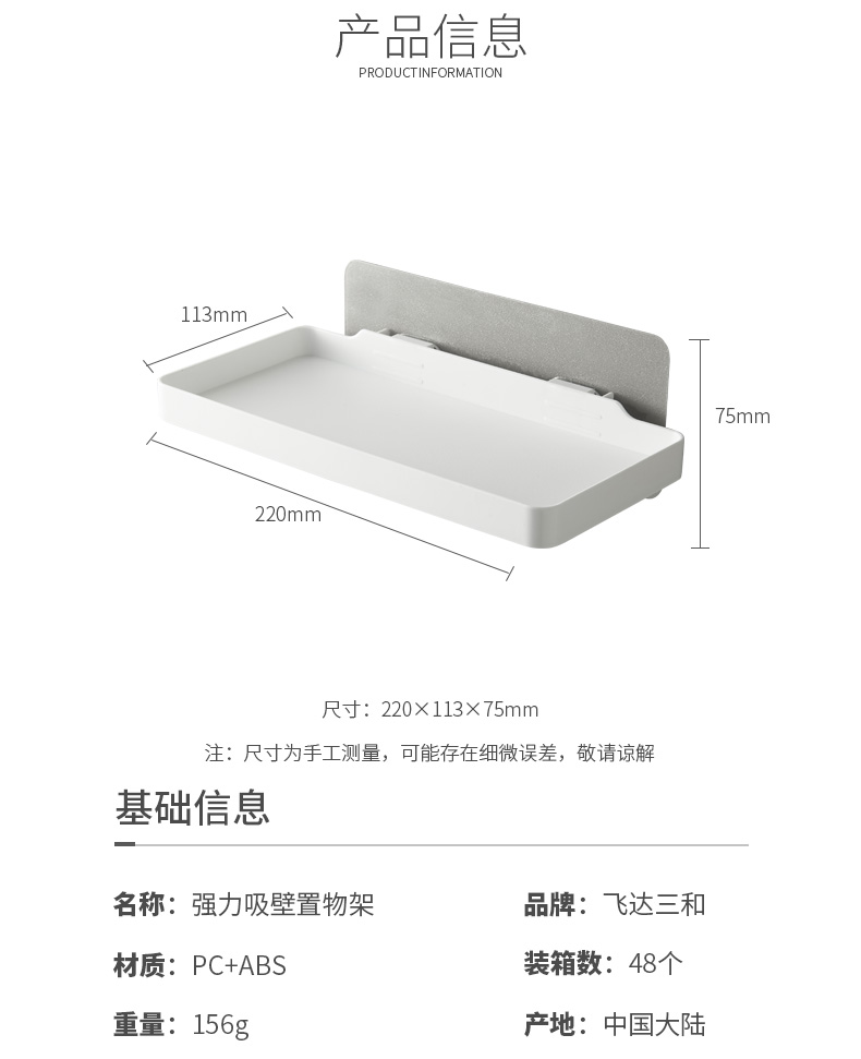 品牌名称:米兰(中国)三和 生产地区:中国·浙江·台州 米兰(中国)货号:R5450 装箱数:48 米兰(中国)尺寸:22*11.3*7.5cm 外箱尺寸:45*31.5*33.5cm 条形码:6931643818377 米兰(中国)三和R5450 强力吸壁置物架