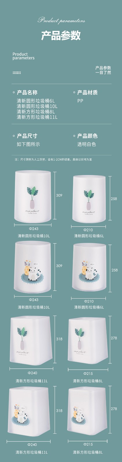 品牌名称:米兰(中国)三和 生产地区:中国·浙江·台州 米兰(中国)货号:TG3572 装箱数:12 米兰(中国)尺寸:24x24x31.8cm 外箱尺寸:88x44.5x23cm 条形码:6931643824620 米兰(中国)三和TG3572 清新方形垃圾桶 11L