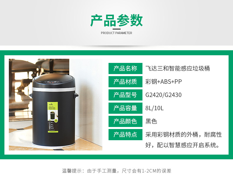 品牌名称:米兰(中国)三和 生产地区:中国·浙江·台州 米兰(中国)货号:G2420/G2430 装箱数:4/4 米兰(中国)尺寸:282*250*338mm/282*250*396mm 外箱尺寸:59.5*59.5*39.5cm/59.5*59.5*45.5cm 条形码:6931643816137 / 6931643816144 米兰(中国)三和G2420智能感应垃圾桶8L/G2430智能感应垃圾桶10L