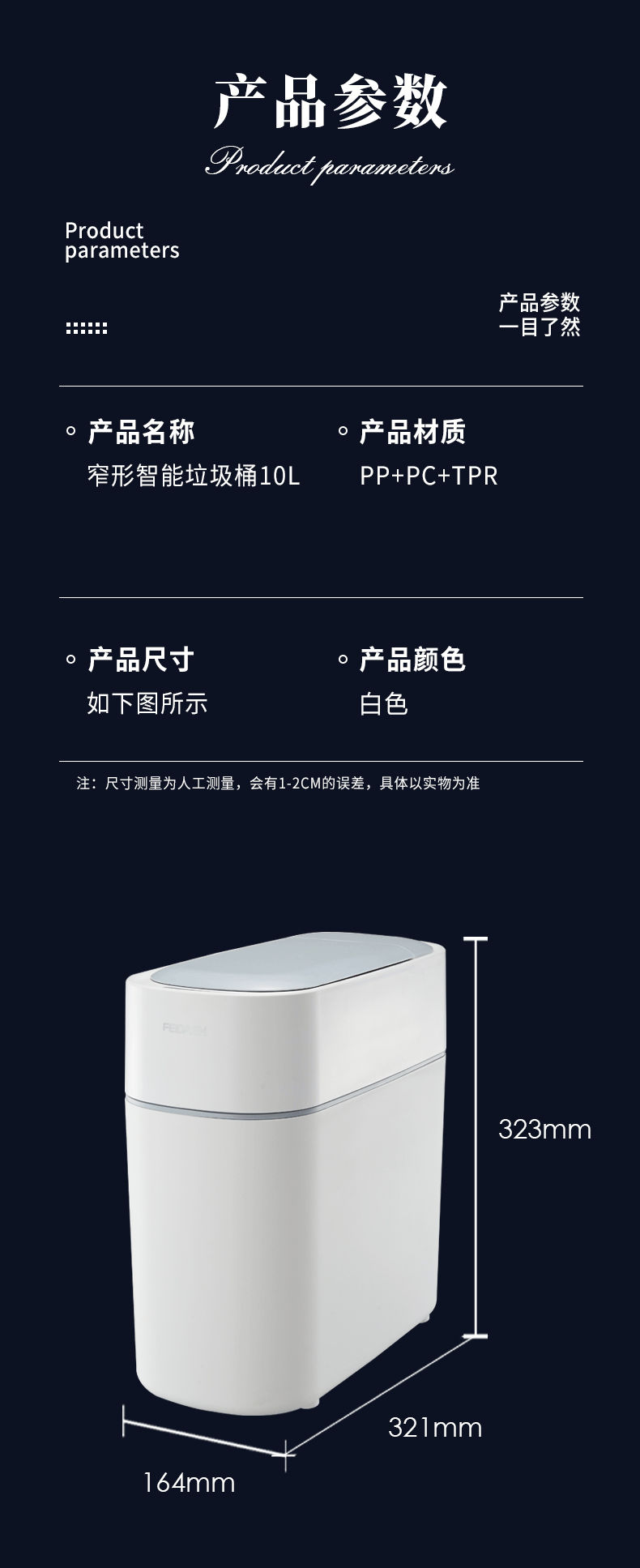 品牌名称:米兰(中国)三和 生产地区:中国·浙江·台州 米兰(中国)货号:TG6100 装箱数:1 米兰(中国)尺寸:32.3x16.4x31.8cm 外箱尺寸:33.5x17.5x33.5cm 条形码:6931643824934 米兰(中国)三和TG6100 窄形智能垃圾桶 10L